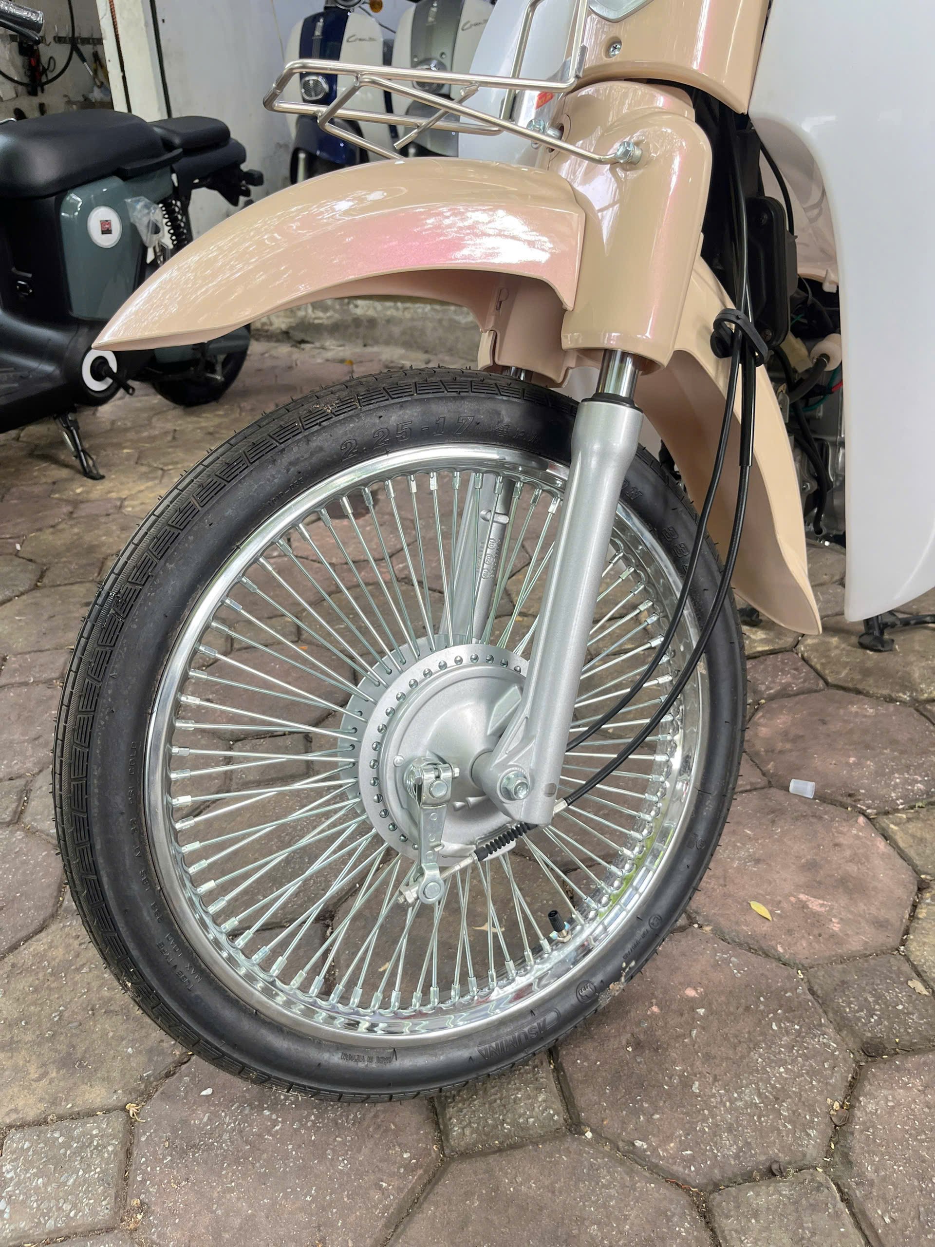 Vành đúc 5 chấu kép sơn đen bạc tạo điểm nhấn cá tính, đồng thời tăng khả năng chịu tải cho xe. Lốp bản lớn hơn giúp Cub New 50SE vành đúc bám đường tốt, chạy chắc và ổn định hơn.