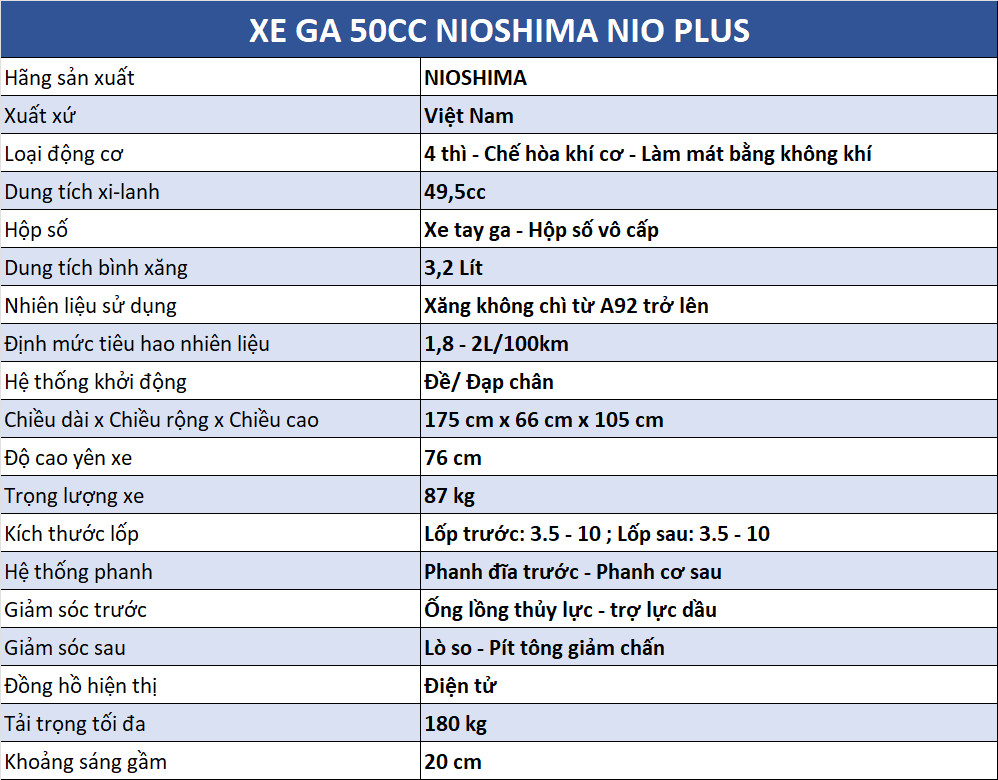 THÔNG SỐ KỸ THUẬT XE NIO PLUS 50CC: