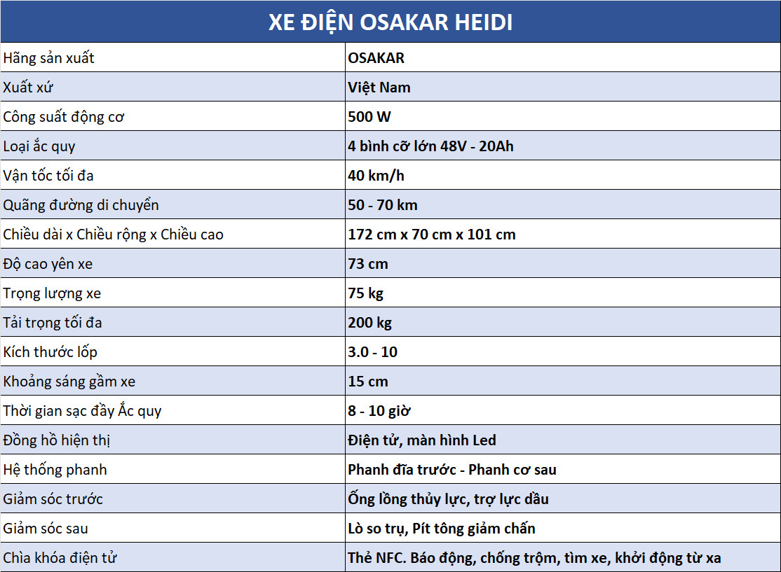 THÔNG SỐ KỸ THUẬT XE ĐIỆN OSAKAR HEIDI: