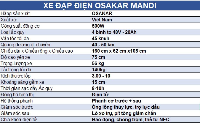 Xe điện Osakar Mandi là một mẫu xe điện đa dụng có thiết kế hiện đại, tương lai. Xe được trang bị bàn đạp, nhưng vẫn đảm bảo đầy đủ các tính năng và tiện ích của xe máy điện. Hơn nữa xe còn được trang bị thẻ NFC mở khóa một chạm cao cấp. Osakar Mandi được trang bị động cơ 500W cùng 4 bình ắc quy cỡ lớn 48V - 20Ah, cho quãng đường di chuyển 50 - 70 km, cùng vận tốc lên tới 40 km/h.