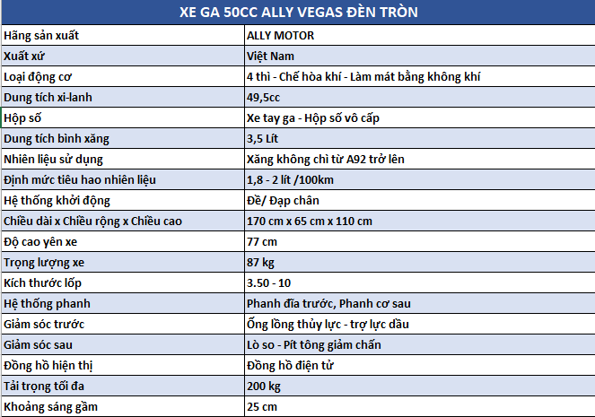 Xe Ga 50cc Ally Vegas R Đèn Tròn - Thiết Kế Thời Trang, Tiện Ích, Không Cần Bằng Lái
