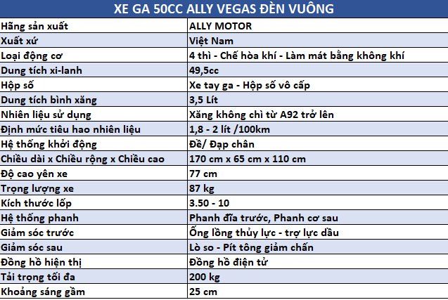 Đánh giá tổng quan về xe ga 50cc Ally Vegas : Xe ga 50cc Ally Vegas ( đèn vuông ) có thiết kế thời trang, động cơ 50cc và nhiều tính năng tiện ích như phanh an toàn, đồng hồ điện tử, và cốp xe rộng. Với khung xe chắc chắn và giá cả phải chăng, Ally Vegas là lựa chọn hàng đầu cho người dùng trẻ. Xe không cần bằng lái và bảo hành lên tới 3 năm tại Xe Lan Anh .
