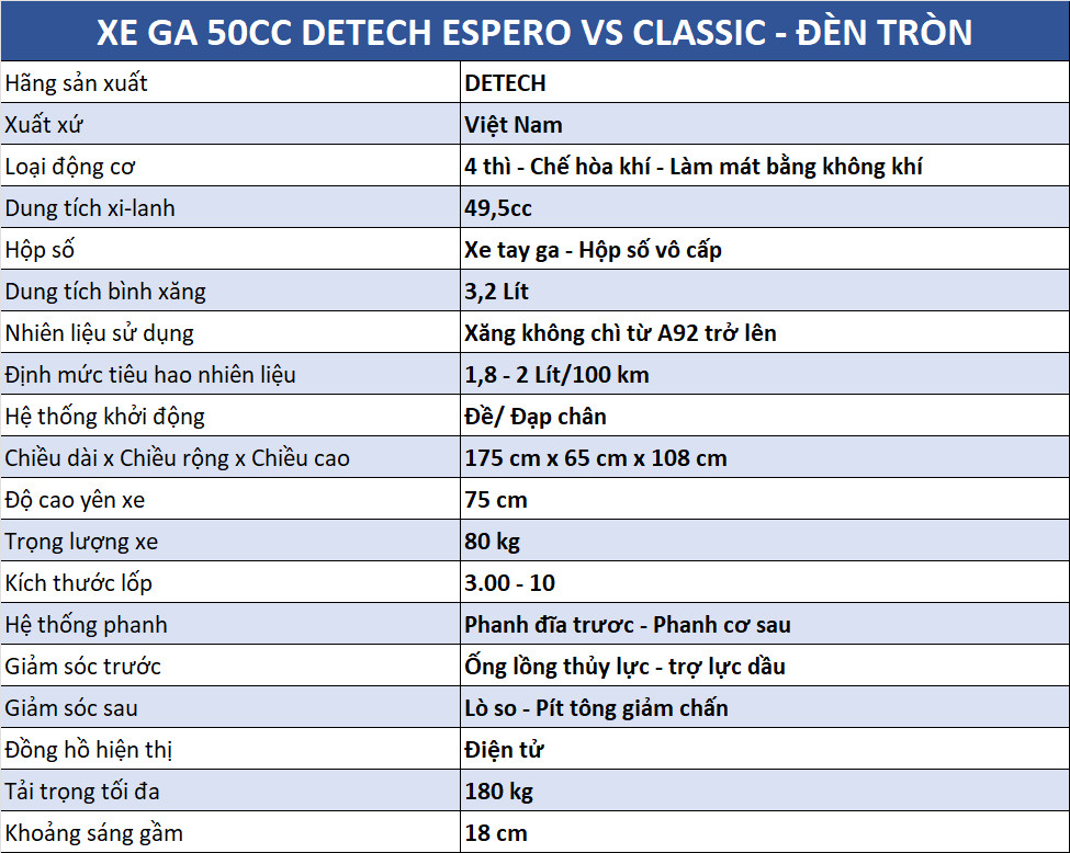 THÔNG SỐ KỸ THUẬT ESPERO VS CLASSIC 50CC: