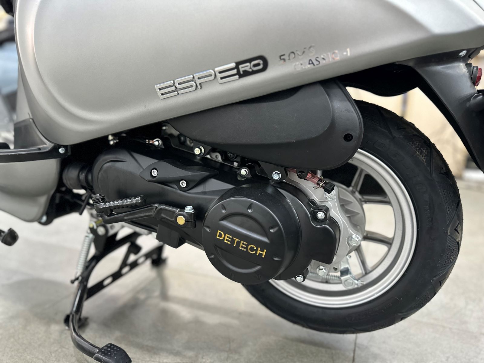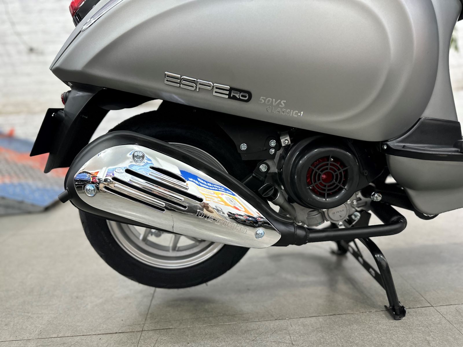 Espero VS Classic 50cc đến từ nhà sản xuất DETECH - Một đơn vị sản xuất, lắp ráp xe máy hàng đầu của Việt Nam. Xe có kiểu dáng thiết kế lấy cảm hứng từ mẫu xe Vecpa huyền thoại, được trang bị động cơ 49,5cc tiết kiệm nhiên liệu, và đặc biệt là không cần bằng lái.