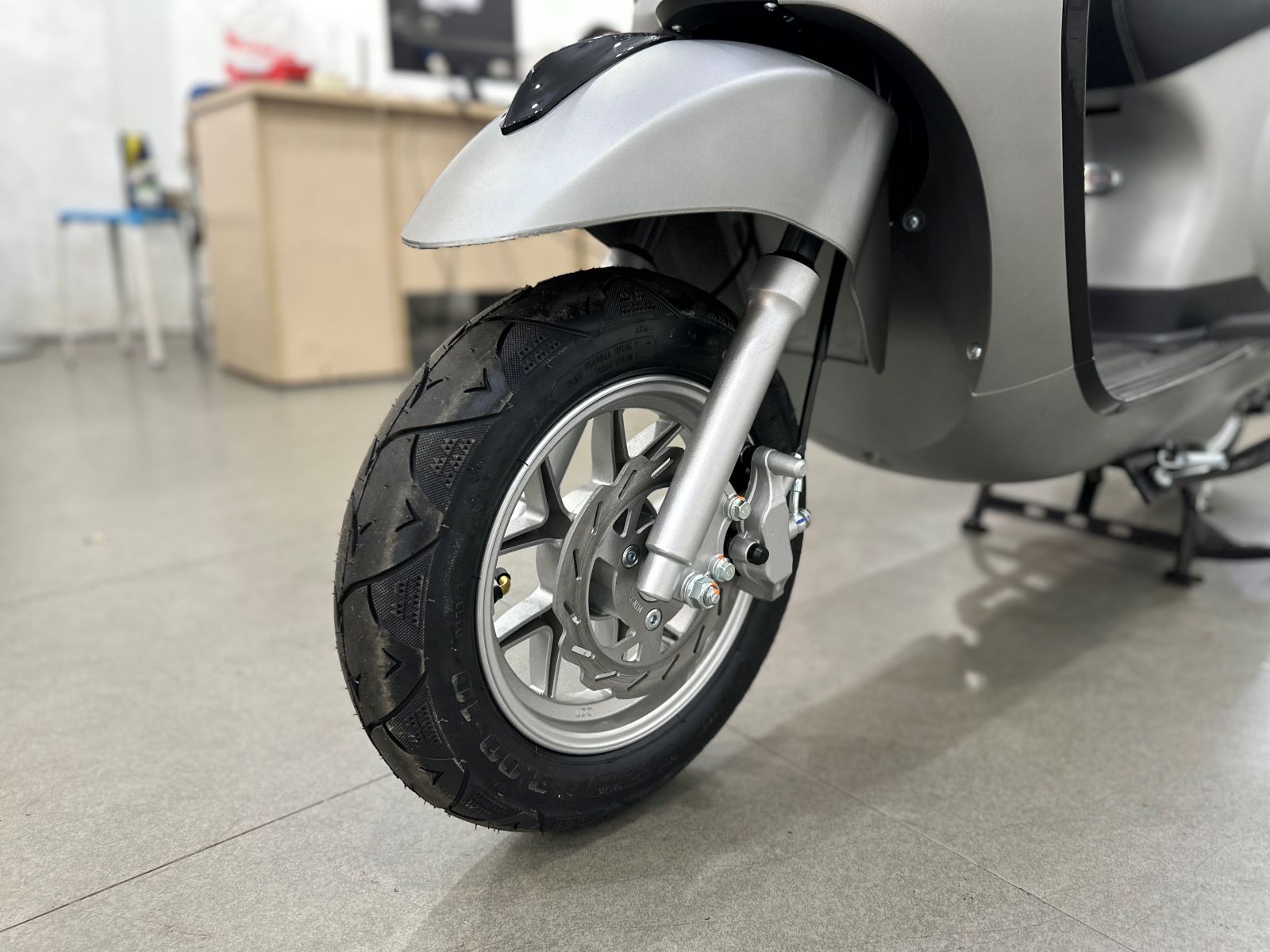 Xe được trang bị lốp không săm an toàn, hạn chế nguy hiểm ngay cả khi dính đinh. Phanh đĩa trước an toàn, phanh cơ sau nhẹ nhàng dễ thao tác. Giảm sóc trước thủy lực trợ lực dầu lên xuống nhẹ nhàng, bật nhả tốt, khiến xe êm hơn.