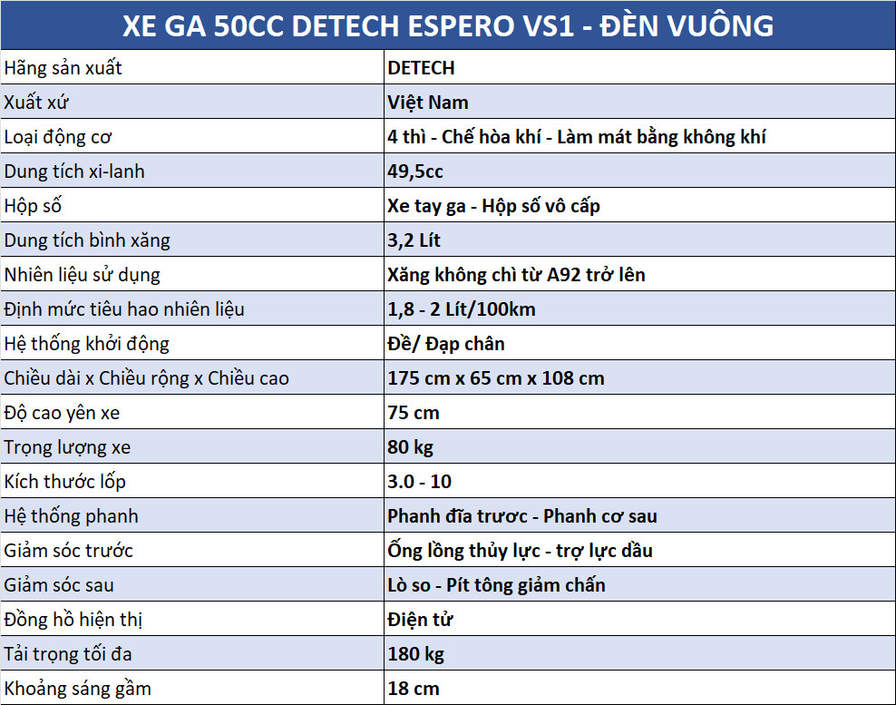 Xe ga Vespa 50cc Espero VS1 đến từ nhà sản xuất DETECH, mang hơi hướng thiết kế của chiếc xe Vespa LX150 nổi tiếng. Xe sử dụng động cơ 49,5cc tiết kiệm nhiên liệu, và không cần bằng lái. Ưu điểm nổi bật của xe Detech là lành, ổn định, ít lỗi vặt.