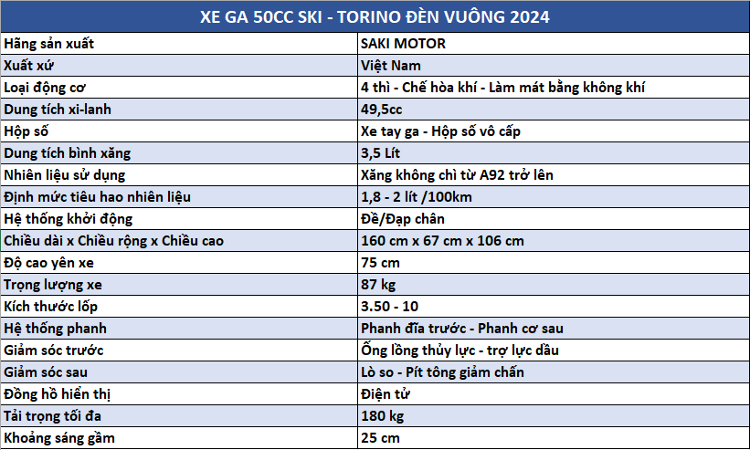 Saki Ski-Torino 50cc là mẫu xe ga 50cc nổi bật với thiết kế đèn vuông đặc trưng, mang đậm phong cách cổ điển kết hợp hiện đại. Đây là lựa chọn hoàn hảo cho những ai đang tìm kiếm một chiếc xe tay ga 50cc không cần bằng lái, vừa đẹp mắt, vừa tiện dụng cho việc di chuyển trong đô thị.