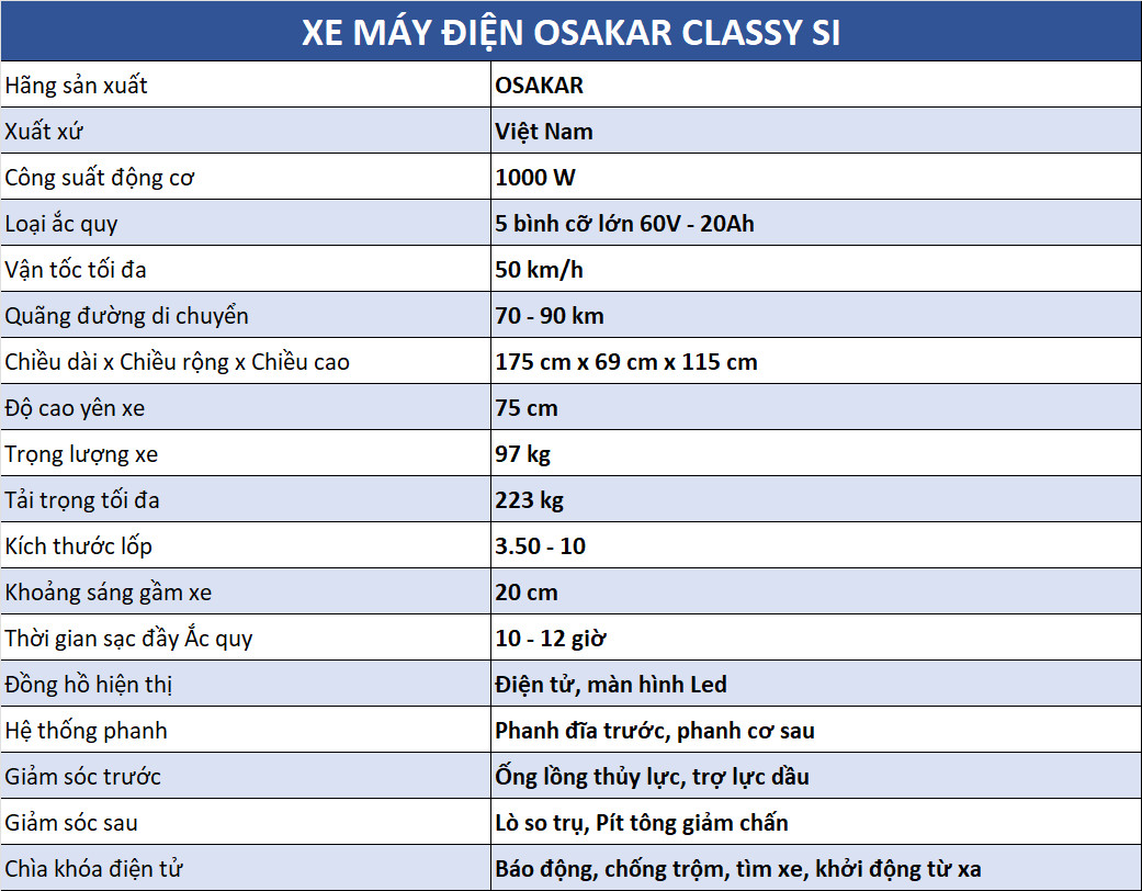 THÔNG SỐ KỸ THUẬT XE MÁY ĐIỆN OSAKAR CLASSY SI